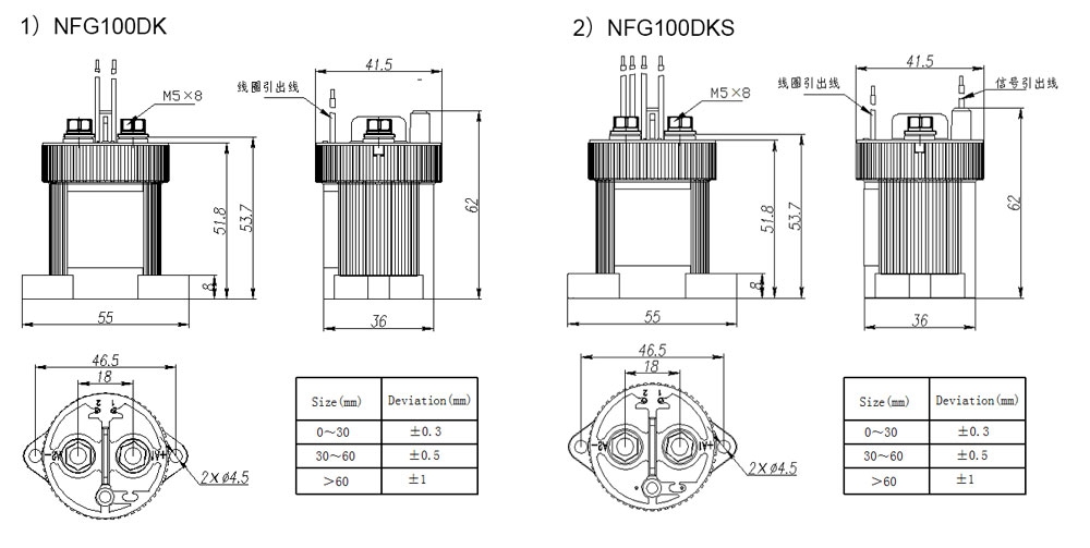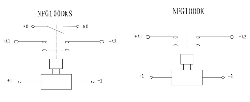 Пример: NFG100DK/24V указывает, что номинальный ток нагрузки изделия составляет 100 А (резистивный), основной контакт — один нормально разомкнутый (внутренняя резьба), напряжение катушки — 24 В постоянного тока, и используется способ установки снизу.