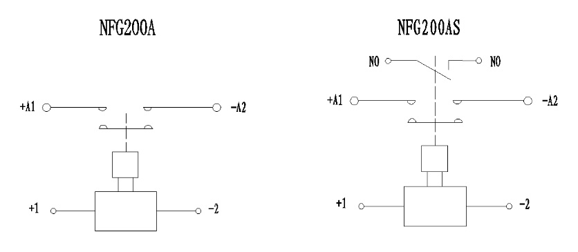 Пример: NFG200AS указывает, что номинальный ток нагрузки изделия составляет 200 А (резистивный), основной контакт представляет собой один нормально разомкнутый (наружная резьба) с одним нормально разомкнутым вспомогательным контактом, напряжение катушки составляет (9~36) В (постоянный ток), и используется способ монтажа снизу.