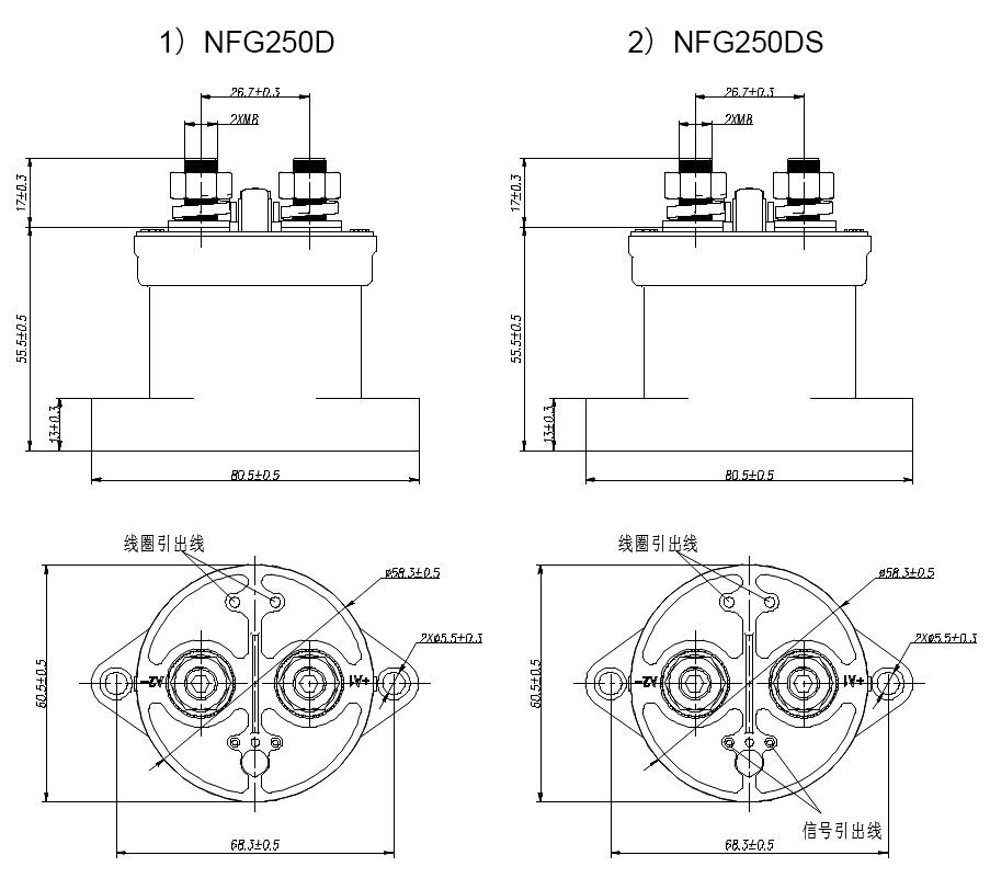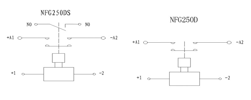 Пример: NFG250DS указывает, что номинальный ток нагрузки изделия составляет 250 А (резистивный), основной контакт представляет собой один нормально разомкнутый (наружная резьба) с одним нормально разомкнутым вспомогательным контактом, напряжение катушки — 12 В постоянного тока, и используется способ установки снизу.