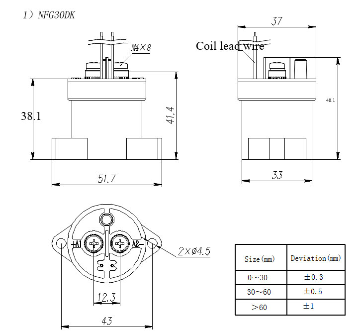 Пример: NFG30DK/24V указывает, что изделие имеет номинальный нагрузочный ток 30 А (резистивный), основной контакт представляет собой один нормально разомкнутый контакт (внутренняя резьба), напряжение катушки 24 В постоянного тока и способ монтажа снизу.