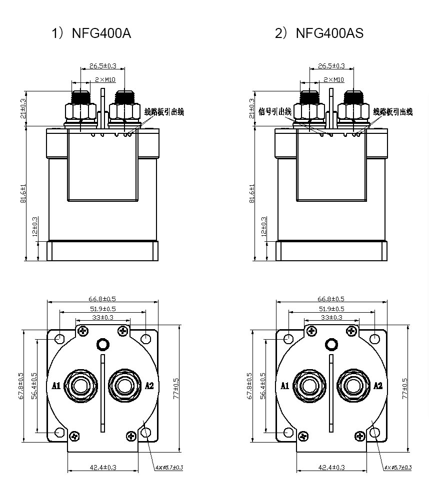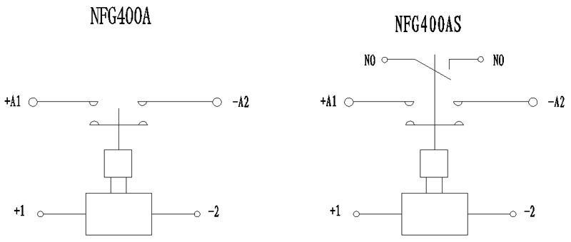 Пример: NFG400AS указывает, что номинальный ток нагрузки изделия составляет 400 А (резистивный), основной контакт — один нормально разомкнутый (наружная резьба) с одним нормально разомкнутым вспомогательным контактом, напряжение катушки — (9-36) В (постоянный ток), способ установки — нижний.