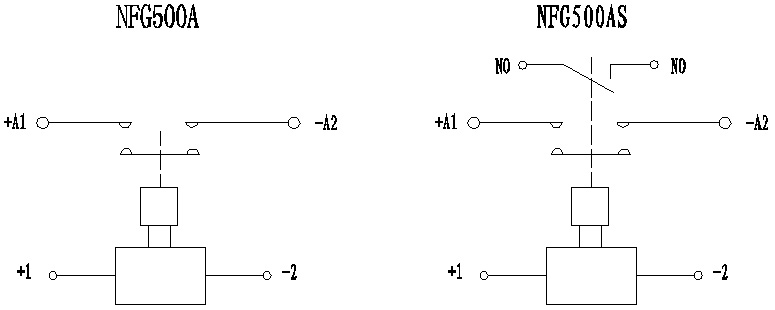 Пример: NFG500AS указывает, что номинальный ток нагрузки изделия составляет 500 А (резистивный), основной контакт — один нормально разомкнутый (наружная резьба) с одним нормально разомкнутым вспомогательным контактом, напряжение катушки — (9-36) В (постоянный ток), способ установки — нижний.