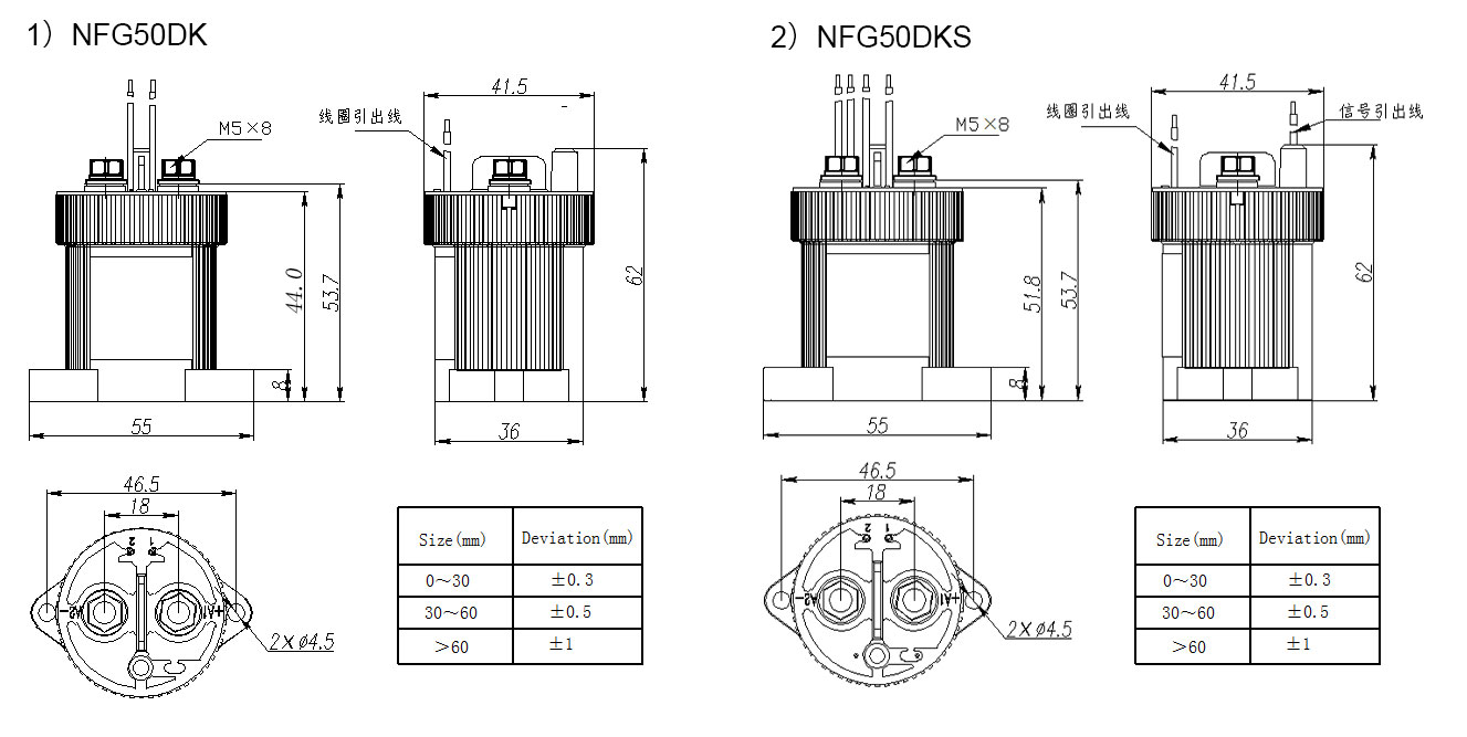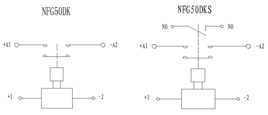 Пример: NFG50DK/24 указывает, что номинальный ток нагрузки изделия составляет 50 А (резистивный), основной контакт — один нормально разомкнутый (внутренняя резьба), напряжение катушки — 24 В постоянного тока, и используется способ монтажа снизу.